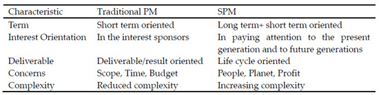 SPM and traditional project management (PM) have a variety of natural differences and there are many contrasting characteristics between SPM and traditional PM [1,2], as shown in Figure 1. While the traditional PM method focuses on achieving project results within a specified time, budget, and quality [3], the SPM approach basically focuses on the entire life cycle of project results, as well as the harmonization of TBL (triple bottom line) aspects (economic, environmental, and social) simultaneously when managing projects [4], primarily focusing on the values and interests of the stakeholders [5]. Furthermore, the authors [6] highlighted the need to consider SPM practices, as improving SPM practices should also be viewed as an opportunity for businesses to create economic, environmental, and social benefits. Additionally, they asserted that SPM could bring long-term benefits to firms, such as improved operational efficiency and reputation.