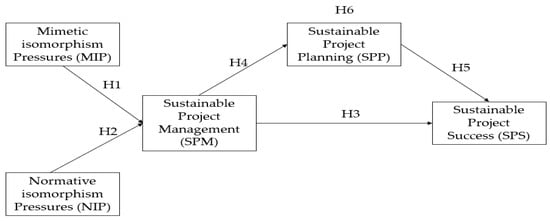 However, there is a gap in the literature, especially regarding the factors and mechanisms that enable SPM practices [9]. Recent academic discussions of SPM have referred to project externalities, which include external stakeholders and institutional isomorphic pressures as contributing factors to SPM [10,11,12,13,14]. Examination of this pressure in the context of projects, however, is still lacking [15] and research findings to date have been inconsistent. For example, some studies have found that institutional isomorphic pressures have little or no effect [16], while other studies have emphasized the enabling role of both mimetic isomorphic pressure (MIP) and normative isomorphic pressure (NIP) on SPM in the manufacturing industry [14,17,18]. Thus, this paper aims to fill this research gap. Moreover, this study included MIP and NIP as the antecedent variables that enable SPM in developing countries, such as China.