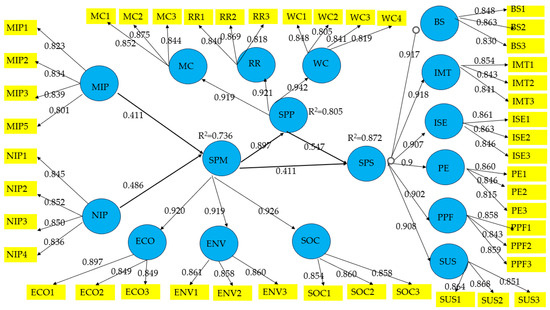 The hypotheses were tested using a bias-corrected and accelerated bootstrap procedure with 5000 subsamples, as proposed by Hair et al. [51]. The empirical results and hypothesis tests of the structural model are shown in Table 6. Figure 3 shows the path graph for these construct relationships. More accurate and precise constructs are supported by higher R2 values: SPM explained 73.6% of the variance, SPP explained 80.5% of the variance, and SPS explained 87.2% of the variance.