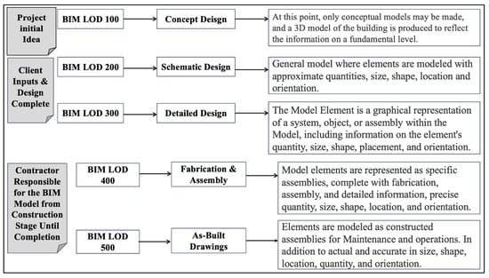 Mitigate Risk and Reduce Cost: A study by McKinsey found that 75% of organizations that have embraced BIM have experienced positive returns on their investments. Closer coordination, especially from contractors, can result in reduced tender risk assessments, lower insurance costs, fewer overall variations, and fewer claims’ opportunities. A better understanding of the project before beginning enables more prefabrication and avoids waste of unneeded materials []. Contractors in the (LOD 400) stage can run the BIM model to detect any clashes, if any, and then begin fabricating the necessary objects and materials to finish the project activities precisely, without conflicts and saving time.