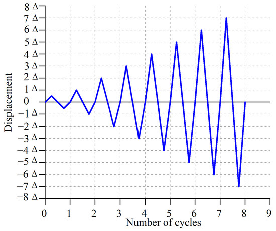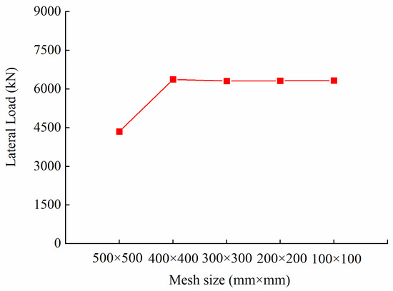 In accordance with the designed model, an FE model of the CboSPSW was developed, and the shell 181 element was adopted to simulate the performances of the columns, beams, CSPs, and stiffeners. The rigid connections between columns and beams and between CSPs and beams simulated the welded connections. The bottoms of columns were fixed, and the out-of-plane displacements of the beams and columns were constrained. Horizontal loads were applied on one end of the column. The loading protocol is shown in Figure 2. The elastic–perfectly plastic model was applied, and the corresponding von Mises yield criterion and the associated flow rule were adopted in the model. CSP imperfections were taken into consideration in the simulation, and the imperfection value of the CSP was obtained by multiplying 1/750 of the CSP height by the results of the out-of-displacement deformation from the eigenvalue buckling of the FE model. The mesh sensitivity analyses for the FE model were carried out, shown in Figure 3. The results show that when the mesh sizes of the FE models are 40 mm × 40 mm, the results obtained by the FE model tend to be stable. The developed meshed FE model is shown in Figure 4.