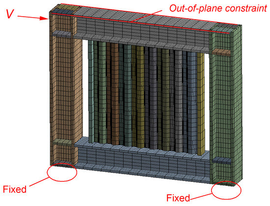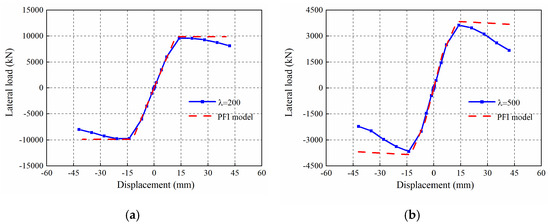 Figure 29 provides a comparison of the load–displacement curves between the FE models ( and 500) and PFI models. From Figure 29, the ultimate load ratio of the PFI model () to the FE model () was 1.05, and the displacement corresponding to ultimate load ratio of the former one to the latter one was 0.92. In the CboSPSW (), the ultimate load ratio of the PFI model () to the FE model () was 1.12, and the displacement corresponding to ultimate load ratio of the former one to the latter one was 0.94. The results show that the PFI models can effectively predict the initial stiffness and ultimate loads of CboSPSWs, which can be used in the design and plastic analyses of CboSPSWs.