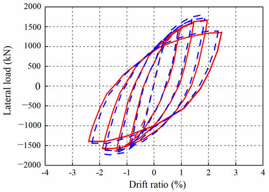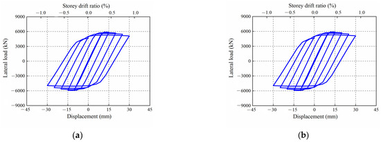 In addition, the energy dissipation coefficient is used to present the energy dissipation capacities of shear walls, which is the ratio of the area enclosed by hysteretic curves () to the elastic strain energy () in each hysteresis loop, which can be expressed as: