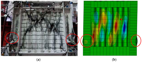 The rationality and accuracy of the developed FE model were verified with a laboratory test [34]. In the test, the sections of columns were H-200 mm × 200 mm × 8 mm × 12 mm, and the top and bottom beams were H-175 mm × 175 mm × 8 mm × 10 mm and H-250 mm × 200 mm × 8 mm × 14 mm. The CSP thickness was 2.0 mm. Comparisons of the hysteretic curves and failure modes obtained from the FE model and test specimen are shown in Figure 5 and Figure 6. From Figure 5, the ultimate load ratio of the FE model to the test specimen was 1.08, and the displacement corresponding to the ultimate load ratio of the FE model to the test specimen was 0.91. Figure 6 shows that the failure modes simulated by the FE model are compressive buckling of the column base under compression and shear loads, which are in line with that of the test. The obtained hysteretic curves and failure modes show that the developed FE model can be used to capture the seismic performance of the CboSPSW.