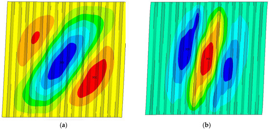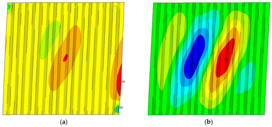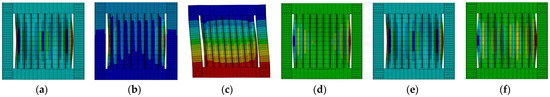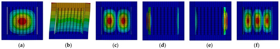 First six vibration modals and natural frequencies of the CboSPSW without free-edge stiffeners. (a) First vibration modal (f1 = 51.9 Hz); (b) 2nd vibration modal (f2 = 52.8 Hz); (c) 3rd vibration modal (f3 = 55.4 Hz); (d) 4th vibration modal (f4 = 56.1 Hz); (e) 5th vibration modal (f5 = 64.3 Hz); (f) 6th vibration modal (f6 = 71.5 Hz).