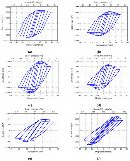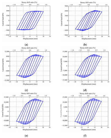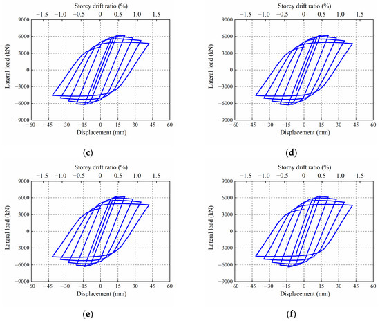 Hysteretic curves of CboSPSWs with different height–thickness ratios. (a) ; (b) ; (c) ; (d) ; (e) ; (f) .