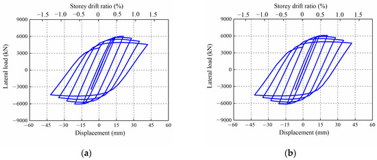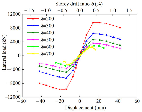 Six specimens with different height–thickness ratios (200, 300, 400, 500, 600, and 700) were developed to investigate the effect of the height–thickness ratio on the seismic performances of CboSPSWs. The corresponding thicknesses of the CSPs were 30.0, 15.0, 7.5, 6.0, 5.0, and 4.3 mm, respectively. The CSP heights of these models were 3100, CSP width 3000 mm, corrugation depth 77 mm, horizontal projection of the inclined panel width 77 mm. The other parameters remained unchanged. The geometric parameters of these models are shown in Table 2. The hysteretic curves and skeleton curves are shown in Figure 9 and Figure 10.
