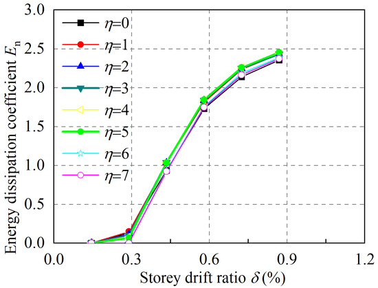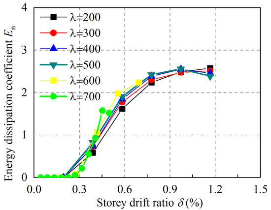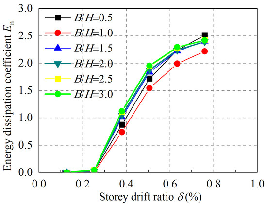 The curves of the energy dissipation coefficients versus the aspect ratio are shown in Figure 16. The dissipation coefficient increased with an increase in the drift ratio, which shows the shear walls had stable dissipation capacities, and the energy dissipation coefficient increased with increases in the aspect ratios when the drift ratios were fixed.
