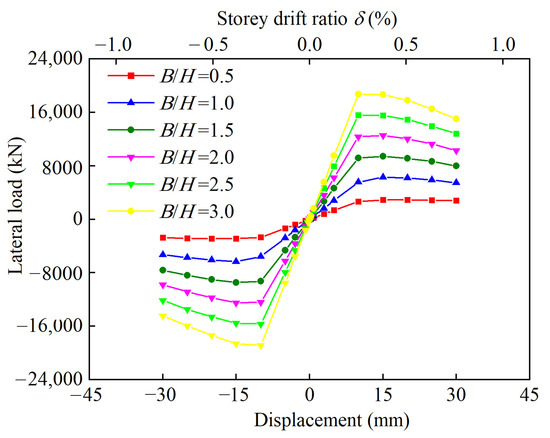 The effect of the aspect ratio on the hysteretic performances of CboSPSWs was investigated. Six CboSPSW specimens with different aspect ratios ( = 0.5, 1.0, 1.5, 2.0, 2.5, and 3.0) were developed, and the CSP heights remained unchanged. The geometric parameters of these models are shown in Table 4. The hysteretic curves and skeleton curves of these models are shown in Figure 13 and Figure 14.