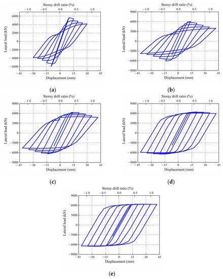Hysteretic curves of CboSPSWs with different corrugation angles. (a) ; (b) ; (c) ; (d) ; (e) .