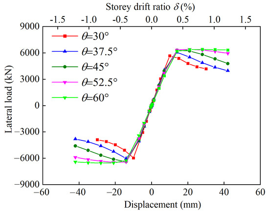The corrugation angle influences the area moment of inertia and the out-of-plane stiffness of CSPs. Five specimens with different angles (30°, 37.5°, 45°, 52.5°, and 60°) were established to study the effect of the corrugation angle. In these models, the corrugation angles were changed by adjusting the depths of corrugation in the CSPs, and the corresponding corrugation depths were 44, 59, 77, 100, and 133 mm. The CSP height () and subpanel width () remained unchanged. The detailed parameters of the CboSPSWs are shown in Table 5. Hysteresis curves and skeleton curves with various corrugation angles are shown in Figure 17 and Figure 18.