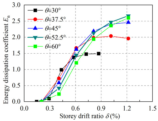 Figure 17 shows that the shapes of the CboSPSWs became much fuller as the corrugation angles increased. The ultimate strengths of the CSPs showed a positive relationship with the corrugation angle, as shown in Figure 18. This was because the in-plane bending stiffness and out-of-plane strength increased as the corrugation depths increased. Curves of the energy dissipation coefficients versus the corrugation angle are shown in Figure 19. When the corrugation angle was 30°, the dissipation coefficient was small, and the corresponding hysteresis loop area and the displacement ductility were small. When the corrugation angles were 45° and 52.5°, the dissipation coefficient showed large and stable energy dissipation capacities and large ultimate strengths.