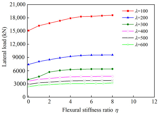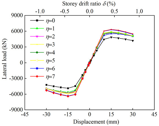 Eight CboSPSW specimens () with different flexural stiffness ratios ( = 0, 1, 2, 3, 4, 5, 6, and 7) were developed. The detailed parameters of these models are shown in Table 6. Hysteresis curves and skeleton curves with different flexural stiffness ratios are shown in Figure 21 and Figure 22.