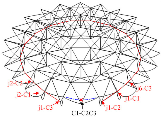 Affiliated Joints: As shown in Figure 4, the cable-strut joints j1-C2 and j1-C3 have the characteristic that neither end of the hoop cable generates tension, and the members connected to the joint (including struts, hoop cables, and radial cables) are all stress-free. These joints are similar to auxiliary structures, serving as mechanisms attached to the overall structure and have no impact on the structural load. Generally, joints that do not participate in forming a new tension path are considered affiliated joints.