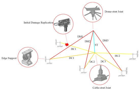 Regarding the numerical simulation algorithm for the slippage and detachment of cable-strut joints, this study does not consider the specific mechanical behavior of cable-strut joints’ slippage and detachment. Instead, it focuses on their impact on the upper dome. That is, once the cable-strut joint slips, the connected strut can no longer support the upper dome, which has been experimentally verified.