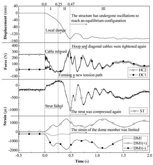 - Stage II, or the formation of a new tension path, is from 0.25–0.47 s. As the dome-strut joint descended, the hoop cable HC2 and diagonal cable DC1 began to tighten again to form a new tension path due to the inability of the discontinuous cable-strut joint to slide. Their force changes were consistent and reached a maximum force of 350 N at 0.47 s. Simultaneously, the axial force in the strut began to compress, and at 0.47 s, the axial strain in the strut reached its peak of −1050 uε. The strain in the upper shell component DM1 continued to increase, with the strain peak at the lower edge reaching −1915 uε. However, as the strut started supporting the upper dome member DM1 again, its strain began to stabilize.