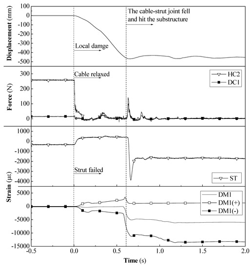 From the strain time history at the dome member DM1, it can be observed that after the failure of the hoop cable HC1, the bending moment in the upper member DM1 sharply increased, and the strain was significantly higher than that in the discontinuous cable-strut joint model. Moreover, due to the absence of a new tension path in the lower cable-strut system, its strain kept increasing until the cable-strut joint collided with the substructure at 0.62 s, at which point the structure had completely collapsed.