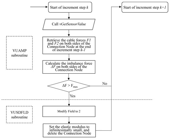 When the imbalance force ΔF on both sides of the cable-strut joint exceeds the joint’s maximum static friction force Fmax, it is considered that the cable-strut joint has slipped and the connection node has failed. At this point, the connection node needs to be deleted. This requires the combined use of field variables and state variables, using the user subroutine VUSDFLD to change the values of the state variables, thereby controlling the life and death of the unit. In Abaqus, state variables are related to calculations, and they are intermediates or results generated during calculations. An essential application of state variables is to pass and invoke analysis results between different analysis parts. A common application is to control the unit’s deletion status by specifying a particular state variable’s value. Therefore, in the hinged state, both field variables and state variables are defined as 1. When the cable-strut joint slips, the field variable is changed to 2. At this time, the state variable becomes 0, realizing the deletion of the connection node (Abaqus/Explicit stipulates that if the deletion of elements is allowed, the element is deleted when the state variable is 0). The entire algorithm process is shown in Figure 11, and its main steps are as follows: