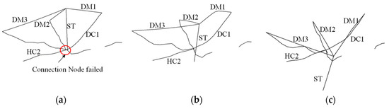 Both the test and numerical simulation results [15,16] showed that after the failure of the outer hoop cable C1-C2C3, a new tension path was formed in the outer ring of the suspended dome (Figure 4). At this moment, based on the different load-bearing states of the hoop cables connected at both ends of the cable-strut joint, the joints can be divided into three load-bearing states.
