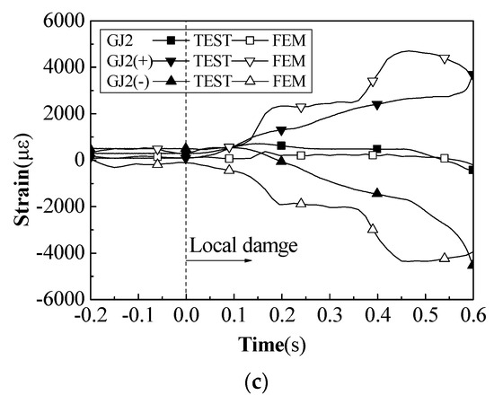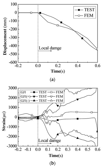 It should be noted that in the test, the progressive collapse process terminated after 0.62 s due to the impact of the cable-strut joint on the substructure. However, by this time, the structure had already undergone a complete flipping deformation. Therefore, the finite element calculations after 0.62 s are invalid, so only the results before 0.62 s are compared here. Figure 13 shows that, in terms of displacement and strain levels, the finite element calculation results and test results both have a high degree of agreement.