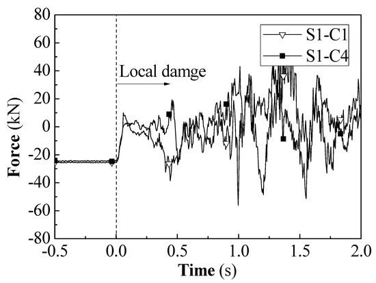 The axial force of the struts S1-C1 and S1-C4 dropped rapidly to zero.