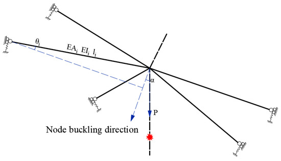 In summary, the weakening coefficient caused by the sliding and falling off of the cable-strut joint can be expressed as the stability resistance index of the continuous cable-strut joint divided by the stability resistance index of the discontinuous cable-strut joint, as shown in Equation (1), where n represents the number of diagonal or radial rods connected to the unsupported joints, E is the modulus of elasticity, Ai is the cross-sectional area, Ii is the second moment of area of the cross-section, li is the member length, and θi is the tilting angle, as shown in Figure 18.