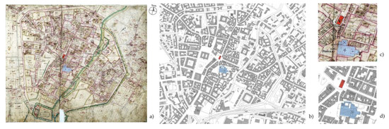 The historic center of Monza on the Theresian Cadastre map (1721) (a,c) and on a recent map (b,d). The Arengario is in red and the Cathedral is in light blue. The Palace on the east side of the Arengario was demolished in 1903.