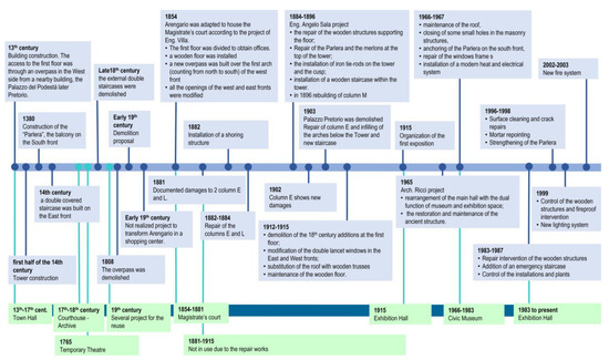 The Arengario construction probably dates back to the second half of the 13th century [48], when it was built as the new Monza’s Town Hall; the construction was certainly completed before 1297. Figure 4 resumes the timeline of the main interventions and of the uses of the building.