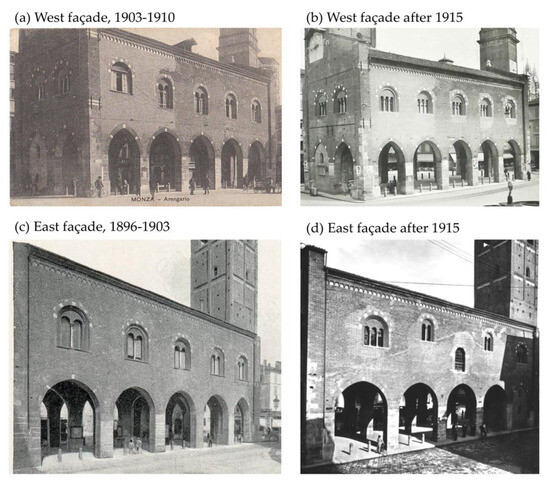 At the beginning of the 19th century, the Municipality evaluated a proposal to demolish the Arengario to obtain more free space in the city center. However, the monument was kept with the idea of transforming it into a shopping center. Luckily, the plan was never realized, though in 1854, the first floor was adapted to host the offices of the Magistrate’s Court according to the project of the Engineer Villa [48]. The new use involved a series of changes to the interiors and the façades; the first floor was divided with longitudinal and transversal walls to obtain a series of offices and a wooden floor was installed to separate the volume in height. Furthermore, a new overpass was built over the first arch (counting from north to north) of the east front, and all the openings of the east and east fronts were modified, obtaining tall double-lancet windows. Specifically, the height was increased and, on the east front, the position was changed to obtain the regular distribution of the openings. On the contrary, the north and north facades were not altered.