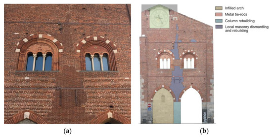 Detail of the north side (a) and part of the stratigraphic survey with the main interventions on the north façade (b). During the intervention of the late 19th century, the masonry was locally demolished and rebuilt. This is clearly readable by the changes in the masonry texture, the brick color, and the surface compactness.