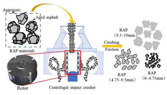 The refined decomposition equipment is composed of several subsystems, including a feeding system, a vibrating screen system, a centrifugal impact crusher, a dust removal system, etc. The core subsystem of refined decomposition is the centrifugal impact crusher. When the RAP enters the centrifugal impact crusher, it obtains kinetic energy from the high-speed rotating rotor and is thrown out. The thrown RAP collides and rubs violently with the crusher’s baffle and falling RAPs. The “false particles” of the RAP are broken along the asphalt interface between aggregates. The broken RAP is divided into coarse RAP (≥5 mm) and fine RAP (0–5 mm). The coarse RAP surface contains little asphalt due to the collision and friction, and most of the asphalt enters the fine RAP to realize the separation of the asphalt and coarse aggregate. This process is shown in Figure 1.