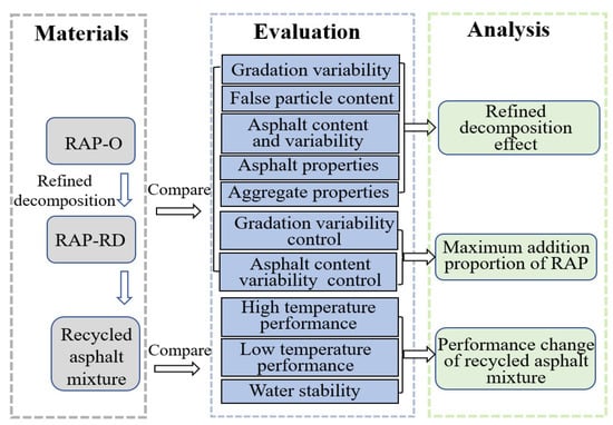 The refined decomposition effect of RAPs is related to many factors, such as the crusher’s rotor speed, the RAP’s properties and temperature and the crusher’s baffle position. The crusher’s rotor speed is a key factor. Moreover, since this test was conducted at a project site and the large refined decomposition equipment (120 t/h) was used in the test, it is difficult to change the position of the crusher’s baffle as well as the RAP’s properties and temperature. Therefore, the collision strength of the RAP was controlled by changing the frequency of the centrifugal impact crusher. The rules and variability of the RAP’s aggregate gradation, asphalt content and aggregate performance were analyzed, and the maximum addition proportion of RAPs was calculated by control methods of gradation variability and asphalt content variability. In addition, the influence of the refined decomposition technology on the road performance of recycled asphalt mixtures is discussed. The scheme of this study is shown in Figure 2.
