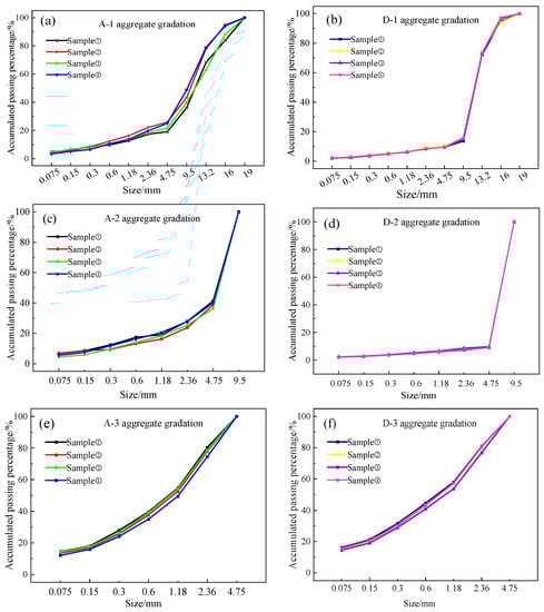 Gradation curves of RAP (extracted). (a) A-1 aggregate gradation curves. (b) D-1 aggregate gradation curves. (c) A-2 aggregate gradation curves. (d) D-2 aggregate gradation curves. (e) A-3 aggregate gradation curves. (f) D-3 aggregate gradation curves.