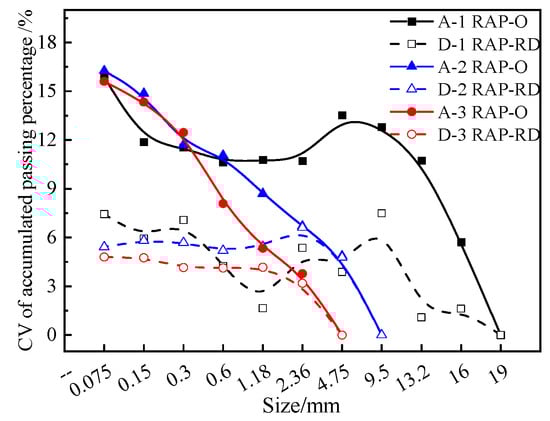 As shown in Figure 3, for the coarse RAP (>4.75 mm), the aggregate gradation curves of the different original RAP samples have obvious differences. The aggregate gradation curves of the different RAP-RD samples are basically the same. The consistency of the aggregate gradation curves of the refined decomposition RAP-RD (D-1 and D-2) is significantly better than that of the original RAP (A-1 and A-2). The results show that the stability of the RAP’s aggregate gradation with refined decomposition is very good. Refined decomposition is beneficial to improve the stability of coarse RAPs’ aggregate gradation. For the fine RAP (0–4.75 mm), the consistency of the refined decomposition RAP’s (D-3) aggregate gradation curve is slightly better than that of the original RAP’s (A-3), and the influence of refined decomposition on the consistency of the coarser RAP’s aggregate gradation curve is greater than that of the fine RAP’s. In order to express the variability of the aggregate gradation more clearly, the coefficient of variation (CV) of the RAP’s aggregate gradation passing percentage was calculated, and the results are shown in Figure 4.