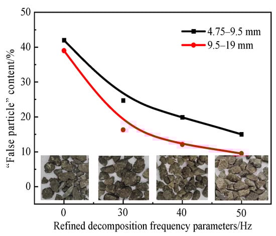 As shown in Figure 8b, the elongated and flaky particles’ content of the aggregates obtained from RAP-RD is lower than that of the aggregates obtained from RAP-O, and as the frequency increases, the elongated and flaky particles’ content of the aggregates gradually decreases. The refined decomposition process is beneficial to reducing the elongated and flaky particles’ content of the coarse aggregates. When the frequency reaches 50 Hz, the elongated and flaky particle contents of the aggregates (50 Hz) of 4.75–9.5 mm and 9.5–19 mm are 4.2% and 4.0%, respectively. Compared to the aggregates obtained from RAP-O (0 Hz), the elongated and flaky particles’ content decreased by 37.3% and 37.5%, respectively. The elongated and flaky particles were easily broken, resulting in a decrease in the elongated and flaky particles’ content of the aggregates obtained from RAP-RD.
