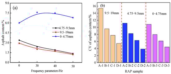 As shown in Figure 6b, the CV of the RAP-RD (30/40/50 Hz) asphalt content is lower than that of the RAP-O (0 Hz). The refined decomposition reduced the variability of the RAP’s asphalt content, which is conducive to improving the quality and stability of the RAP.