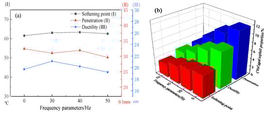 As shown in Figure 7, the change of the aged asphalt’s properties (penetration, softening point and ductility) is not obvious with the increase in frequency. However, the variability of the aged asphalt’s properties (penetration, softening point and ductility) gradually decreases with the increase in frequency. The results show that the refined decomposition process can not change the properties of aging asphalt but can improve the stability of the asphalt’s properties. This is mainly due to the further mixing of the RAP during the collision and friction in the refined decomposition process, which reduces the variability of the RAP’s asphalt properties. In addition, refined decomposition is a physical process (collision and friction between the RAP), which has relatively little influence on the asphalt’s properties.