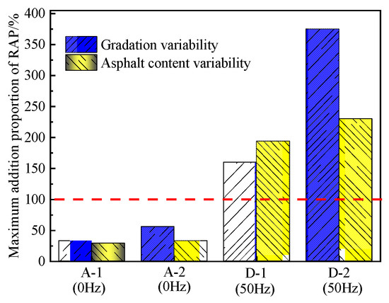 The maximum addition proportion of the RAP was calculated following the gradation variability control method and the asphalt content variability control method, respectively. The results are shown in Figure 9.
