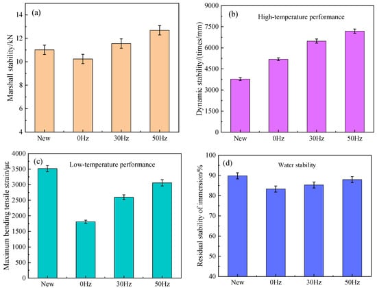 Three kinds of recycled asphalt mixtures were prepared from the refined decomposition RAP with different frequency parameters (new asphalt mixture use for comparative tests). The Marshall stability, dynamic stability, maximum bending tensile strain and immersion residual stability of the recycled asphalt mixture were tested to evaluate its high-temperature performance, low-temperature performance and water stability. The test results are shown in Figure 11.