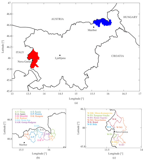 The municipalities investigated are located in two Slovenian regions (Figure 1a). The first region (the Eastern region) is located in the northeastern part of Slovenia, close to the Austrian border. It contains nine municipalities, i.e., Tišina, Radenci, Gornja Radgona, Apače, Sveta Ana, Benedikt, Šentilj, Pesnica and Kungota (see Figure 1b). The second region (the Western region) is located in the western part of the country, near the Italian border. It contains six municipalities, i.e., Kanal, Brda, Nova Gorica, Šempeter–Vrtojba, Renče–Vogrsko and Miren–Kostanjevica (Figure 1c). The two regions are approximately 200 km apart.