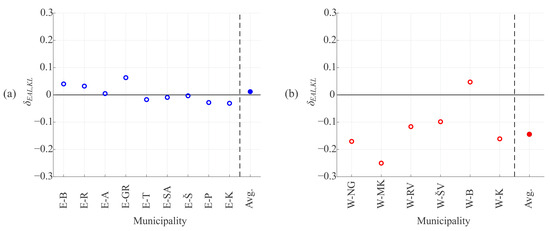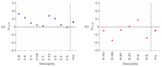The log residuals δEAL,KL (Equation (6)) selected as the measure of bias were estimated for each KL. At the lowest KL (‘1a’; Figure 2), the highest δEAL,KL was calculated for the municipality of Benedikt (+0.17) in the Eastern region, while the lowest δEAL,KL corresponded to the municipality of Miren–Kostanjevica in the Western region (−0.17). Interestingly, most municipalities in the Western region had a negative δEAL,KL, while a majority of the municipalities in the Eastern region had a positive δEAL,KL. Accordingly, the mean δEAL,KL calculated at the regional scale (rightmost dot in Figure 2) was positive for the Eastern region and negative for the Western region. The bias was relatively small in both cases, as the absolute values of δEAL,KL were between 0.05 and 0.06.