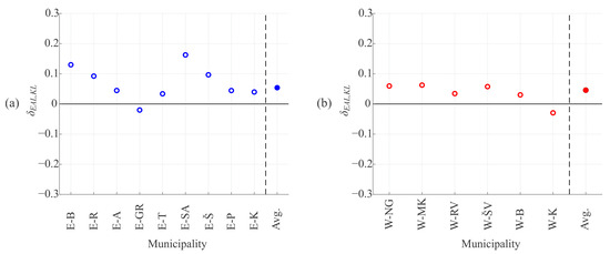An opposite outcome was observed when the floor-area knowledge level was maintained at KLFA = ‘a’ and the location knowledge level was increased to KLL = ‘3’ (Figure 4). In this case, the δEAL,KL values for the municipalities in the Western region generally increased compared to the values obtained at KL = ‘1a’. However, their absolute values decreased and were all lower than 0.07, which means that improving KLL had a significantly better effect on bias reduction than improving KLFA. On the other hand, δEAL,KL for the municipalities in the Eastern region did not drastically change when KL increased from ‘1a’ to ‘3a’ (Figure 4a), and the bias reduction was not as pronounced as when KL increased to ‘1b’. This implies that KLFA was more crucial for this particular region than KLL.