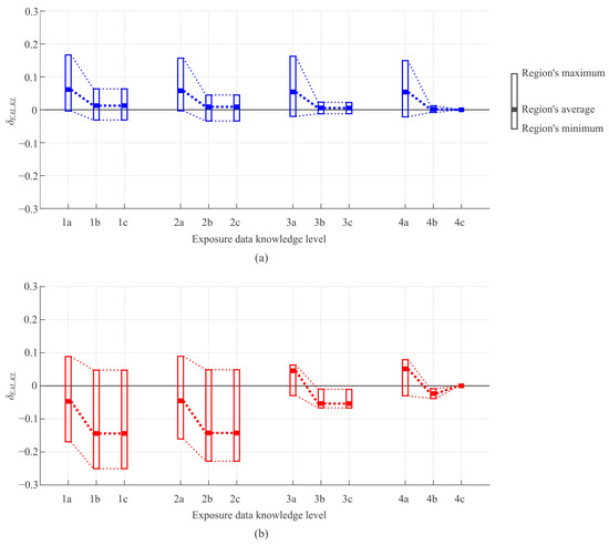 where EALKL is the municipality’s expected annual loss for the building data knowledge level (KL), and EALbase is the municipality’s expected annual loss for the base-case KL. A positive and a negative δEAL,KL indicate overestimation and underestimation of the EAL, respectively. Such a measure of bias was selected because it allows a more straightforward comparison of negative and positive errors than the relative difference (EALKL − EALbase)/EALbase, which is bounded by −100% on the negative side and unbounded on the positive side. However, for low values of δEAL,KL (up to 0.1), the following applies: