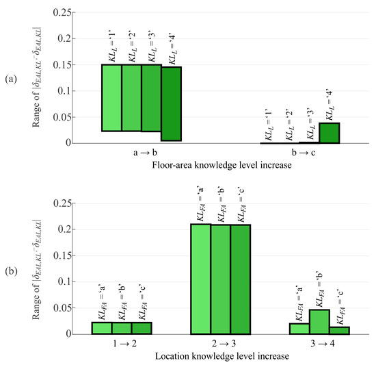 The municipal characteristics affecting the bias at the selected building data knowledge levels were identified in two steps. In the first step, the data types that contribute most to the bias reduction were determined. The results presented in the previous section indicate that the bias at the regional scale can be most reduced by including the data on building density distribution across the municipality (transition from KLL = ‘2’ to KLL = ‘3’) and building-class-specific floor areas (transition from KLFA = ‘a’ to KLFA = ‘b’). However, to obtain a clearer indication of the effect of different data types, the absolute differences in δEAL,KL caused by a gradual increase from knowledge level KL to knowledge level KL′, i.e., |δEAL,KL′ − δEAL,KL|, were also calculated at the municipality level (Figure 6).