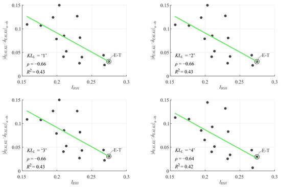 Correlation between IBSH (building stock homogeneity index) and |δEAL,KL′ − δEAL,KL|a→b (the municipality’s absolute difference in δEAL,KL caused by the increase from KLFA = ‘a’ to KLFA = ‘b’) for all location knowledge levels considered.