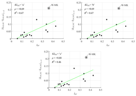 IHV is positively correlated with the absolute difference in δEAL,KL caused by a knowledge level increase from KLL = ‘2’ to KLL = ‘3’, i.e., |δEAL,KL′ − δEAL,KL|2→3 (Figure 8). Regardless of the floor-area knowledge level, ρ was about +0.69, and R2 was approximately 0.47. This positive correlation implies that an increase in IHV intensifies the potential for the hazard variation to alter the municipality’s EAL when data on building density distribution across the municipality are included. For example, for the municipality of Miren–Kostanjevica (W-MK), the average and standard deviation of building-specific EALs calculated for KL = ‘2a’ ( and , respectively) were EUR 137 and EUR 69, respectively. When the buildings were moved from the municipality’s centre to random locations in the municipality, the standard deviation, on average, increased notably ( = EUR 85), leading to = EUR 49 (Equation (10)) and IHV = 0.36 (Equation (9)). Such a high IHV indicates that the municipality’s EAL could change significantly if the buildings were moved to their actual location. This was also indicated by |δEAL,KL′ − δEAL,KL|2→3 being equal to 0.21 (Figure 8). For other municipalities, IHV was between 0.06 and 0.42. The results suggest that for IHV less than 0.1, the hazard variation in the municipality does not have significant potential to cause bias in the estimation of seismic risk.