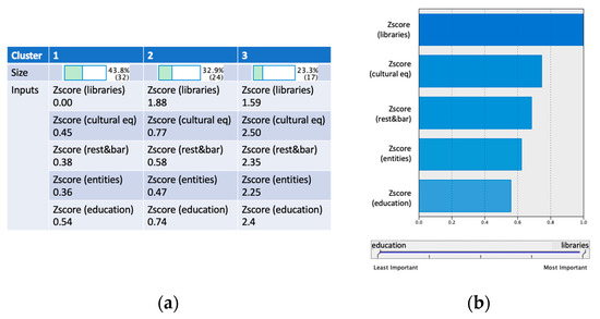 Figure 5a shows the size of each cluster (how many cases each cluster gathers) as well as the relative explanatory power of each of the variables. Figure 5b depicts the relative importance of each variable: the presence of libraries is the most important one within the definition of the SII, followed by the presence of cultural equipment, restaurants and bars, areas dedicated to local entities and finally, education establishments. These are presented by their Z-score, representing their normalised values. The Z-score of each variable was calculated from the raw score minus the population mean, divided by the population standard deviation (the formula that was explained in the previous section). This simple action allows the addition, subtraction and/or comparison of variables with very different scales and scores.