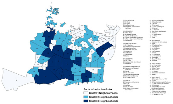 At this point, it is possible to present Figure 6, which depicts the distribution of the neighbourhood’s clusters in relation to their characteristics, composition and degree of social infrastructure. Cluster number 3 shows higher values of all variables included, meaning that these are probably areas of the city that, due to the quality of common spaces, promote more and better social interaction between residents. This map was made using GIS and shows that areas of the central part of the city, as well as the Eixample district (which is currently undergoing a very important transformation such as developing the green axes and superblocks) and some areas of the richer districts of Sarrià and Les Corts, seem to be better prepared in terms of their social infrastructure. It is also very interesting to see that the Vila de Gràcia and Sant Andreu neighbourhoods also seem to be associated with better infrastructure quality. At this point, it may be interesting to test and analyse the relationship between both indices, trying to understand whether one influences the other.