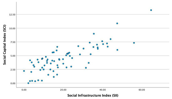 The aim of this section is to statistically analyse the relationship between the two recently created indices. Consequently, it is important to establish the level of association between the two created measures, in order to test whether better social infrastructure conditions might explain higher levels of SC. However, and at the same time, it may be possible to establish whether higher levels of organisation lead to more investment (and interventions) in the form of social infrastructure. This quantitative work is not defining and is intended to provide a picture which is expected to be completed by future qualitative research.