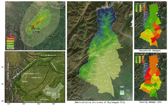Dujiangyan City is located in the northwestern Sichuan Plain. The Wenchuan earthquake impacted the housing of 132,487 rural households (approximately 94% of total rural households in Dujiangyan), with 75% being either collapsed or damaged. Safety appraisal shows that the severely damaged and collapsed houses collectively accounted for 58% (44.34% and 14.12%), and the moderately and slightly damaged houses collectively accounted for 35% (16.57% and 18.64%). Additionally, 73% of the impacted houses (95,130 rural households) needed to be repaired, and 27% of the impacted houses (housing 34,447 rural households) needed to be reconstructed. The rural housing was mainly distributed in mountainous areas near the Longmen Mountain Fracture Zone, with most of these areas being devastated. The damage rate of rural housing in Longchi Town, Xiang’e Township, Zipingpu Town, Yutang Town, and Hongkou Town was 100%, 88%, 94%, 87%, and 69%, respectively. Compared with the above townships/towns, the damage rate of rural housing was relatively low in the townships/towns adjacent to or along the mountainous areas of the Longmen Mountain Fracture Zone. However, compared with the townships/towns in plain areas, the damage rate of rural housing was relatively high (e.g., 25% and 41% in Qingchengshan Town and Daguan Town, respectively). The damage rate of rural housing was considerably low in most plain areas (e.g., 8%, 18%, 12%, 5%, and 11% in Juyuan, Chongyi, Shiyang, Liu-jie, and Anlong Town, respectively) but relatively high in certain plain areas (e.g., 23%, 37%, and 46% in Tianma, Xingfu, and Cuiyuehu, respectively), as shown in Figure 1.